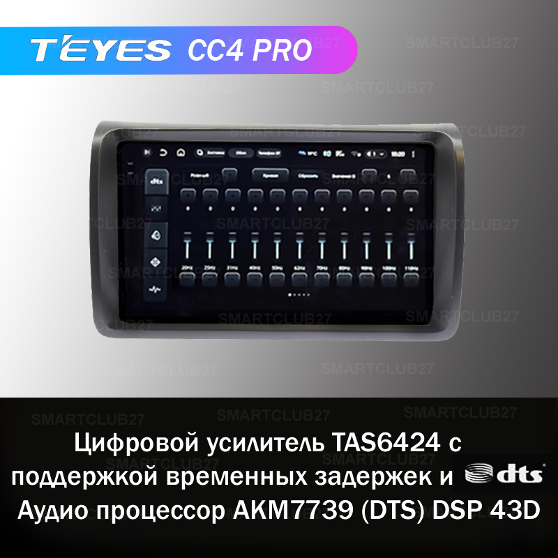 Teyes CC4 PRO обеспечит чистое звучание звука всех форматов, а 27-полосный эквалайзер с регулировкой от 20Hz до 20kHz позволит настроить звучание нужных частот в желаемом диапазоне. В магнитоле есть оптический и коаксиальный цифровой аудиовыхода.